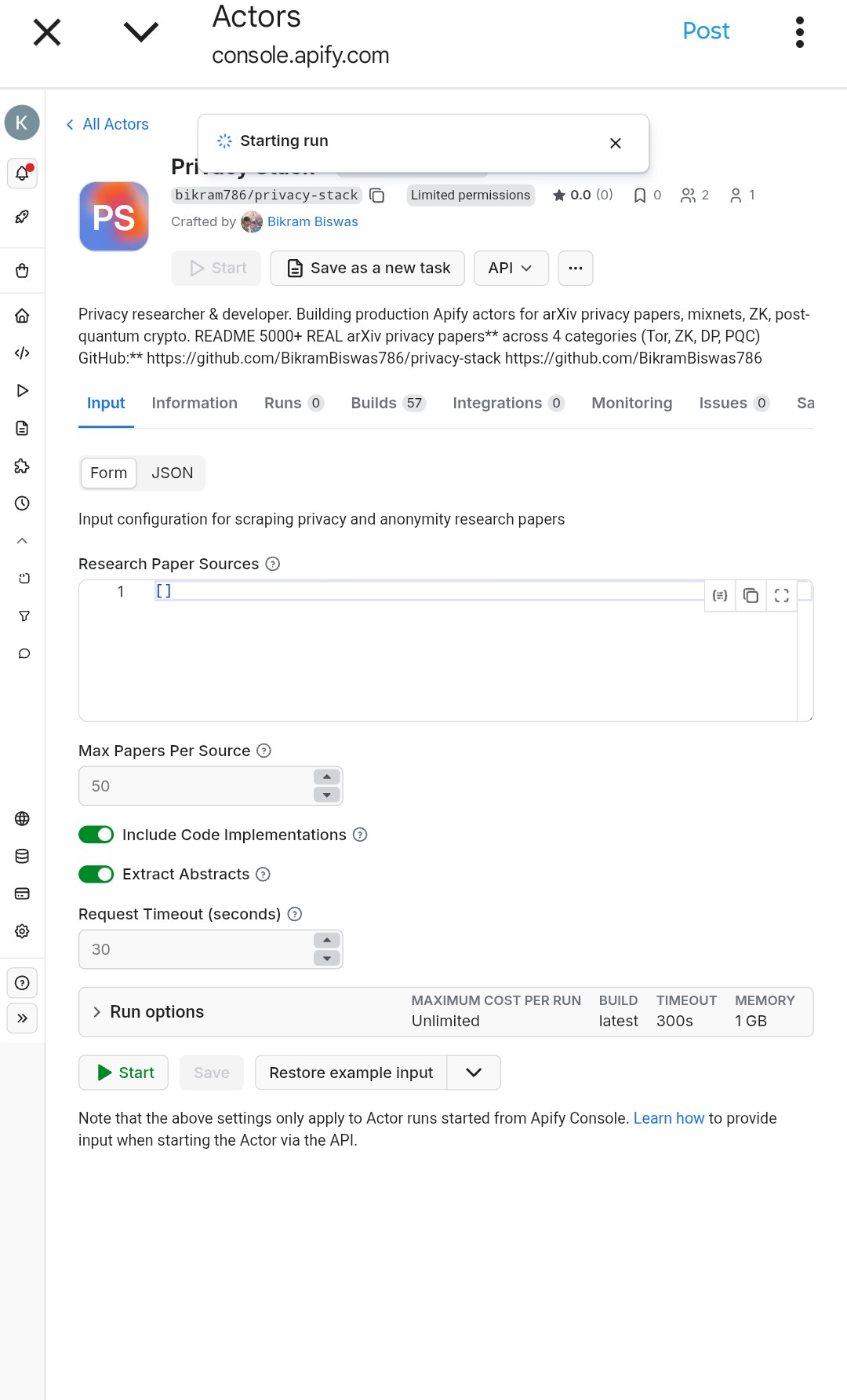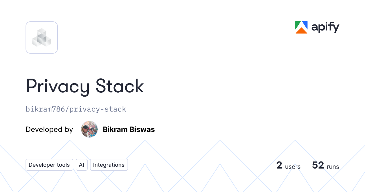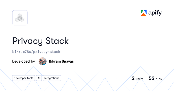(Click “Try for free” right from this page to start using it instantly!) This actor combines everything: It scrapes 5,000+ privacy-related papers from arXiv (cs.CR focus and beyond), covering internet anonymity, cryptocurrency privacy, post-quantum cryptography, zero-knowledge proofs, differential privacy, blockchain anonymity, and more. Balanced across four core categories—Tor, ZK (Zero-Knowledge), DP (Differential Privacy), and PQC (Post-Quantum Cryptography)—with no duplicates and a production-ready schema. Why did I build this? After creating targeted scrapers like Anon Lab and Mixnet, I realized the privacy space is huge and interconnected. Developers shouldn’t have to hunt across multiple tools or sites for ideas, gists, authors, publication dates, or implementation hints. Privacy Stack puts literally all privacy research in one place—thousands of papers ready to fuel your projects, literature reviews, or innovations. Whether you’re building a blockchain app, auditing a VPN, or just researching surveillance resistance, this saves hours (or days) of manual searching. I built it for the community, to democratize access and spark more privacy-focused builds.Features include: 5,000+ real papers (balanced ~1,250 per category)