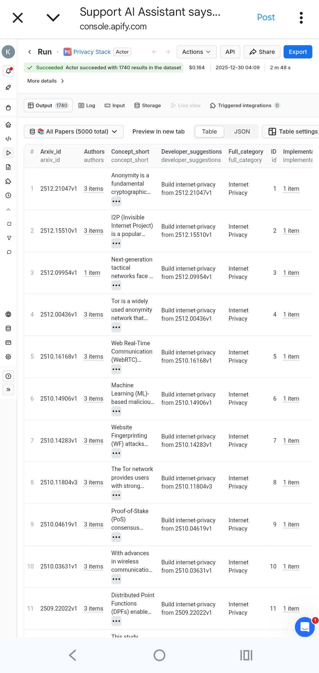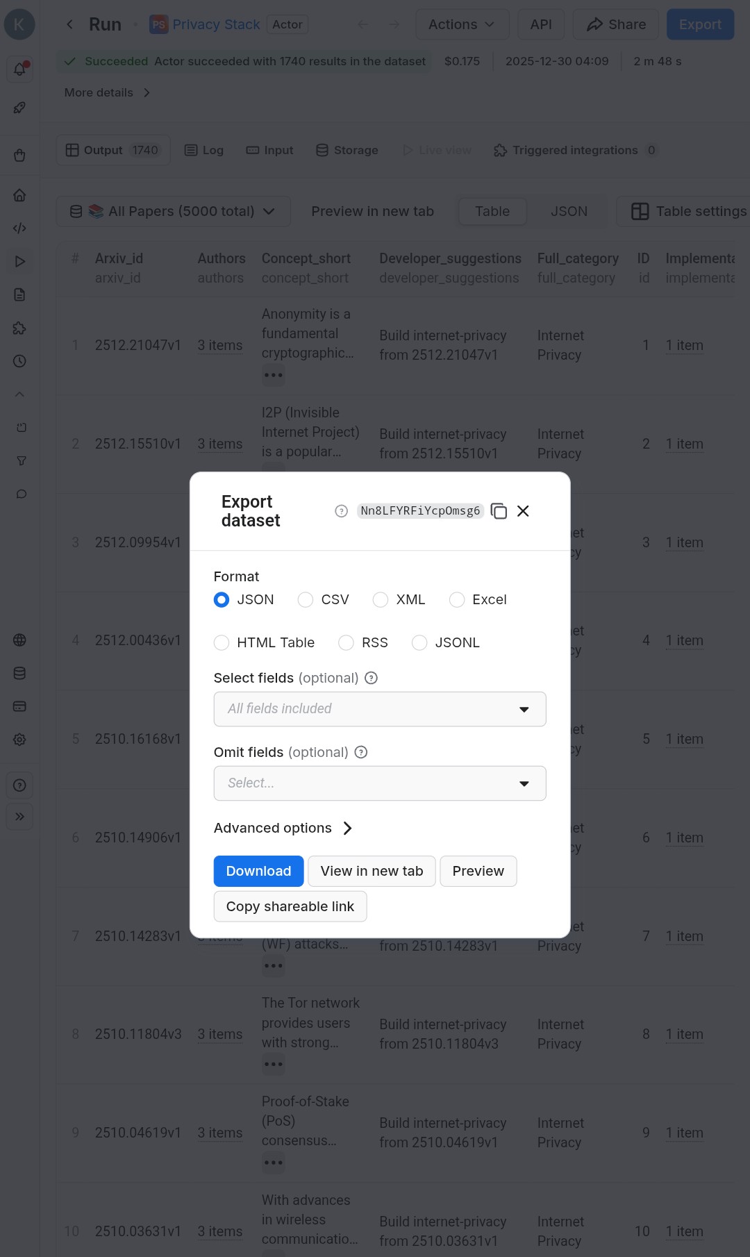 When finished (status: Succeeded): Go to the Output tab . View the clean table (up to 5,000+ entries) . Export as JSON, CSV, Excel, or copy a shareable link . Use it for research, project ideas, literature reviews, or building privacy tools