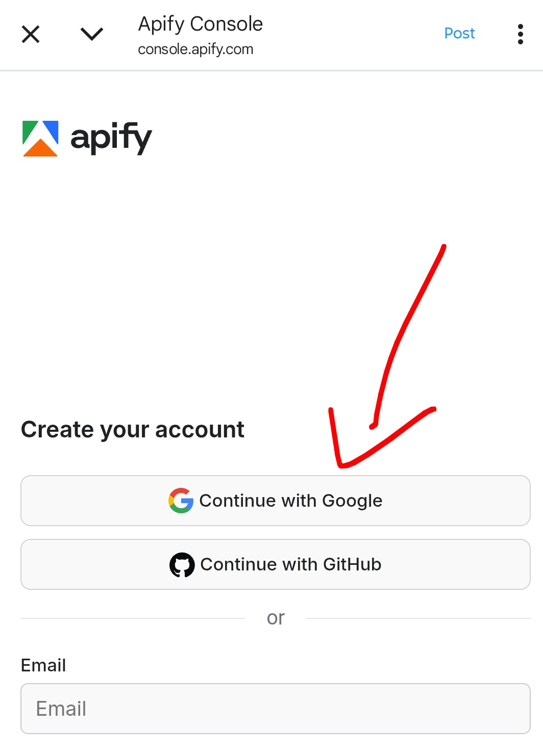 Use Google, GitHub, or email. Free tier works great for testing and small/medium runs.