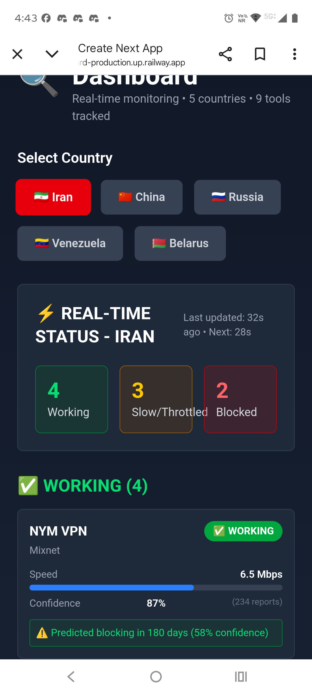 Working: NYM (2.8 Mbps), Psiphon (4.2 Mbps), Lantern (3.8 Mbps)