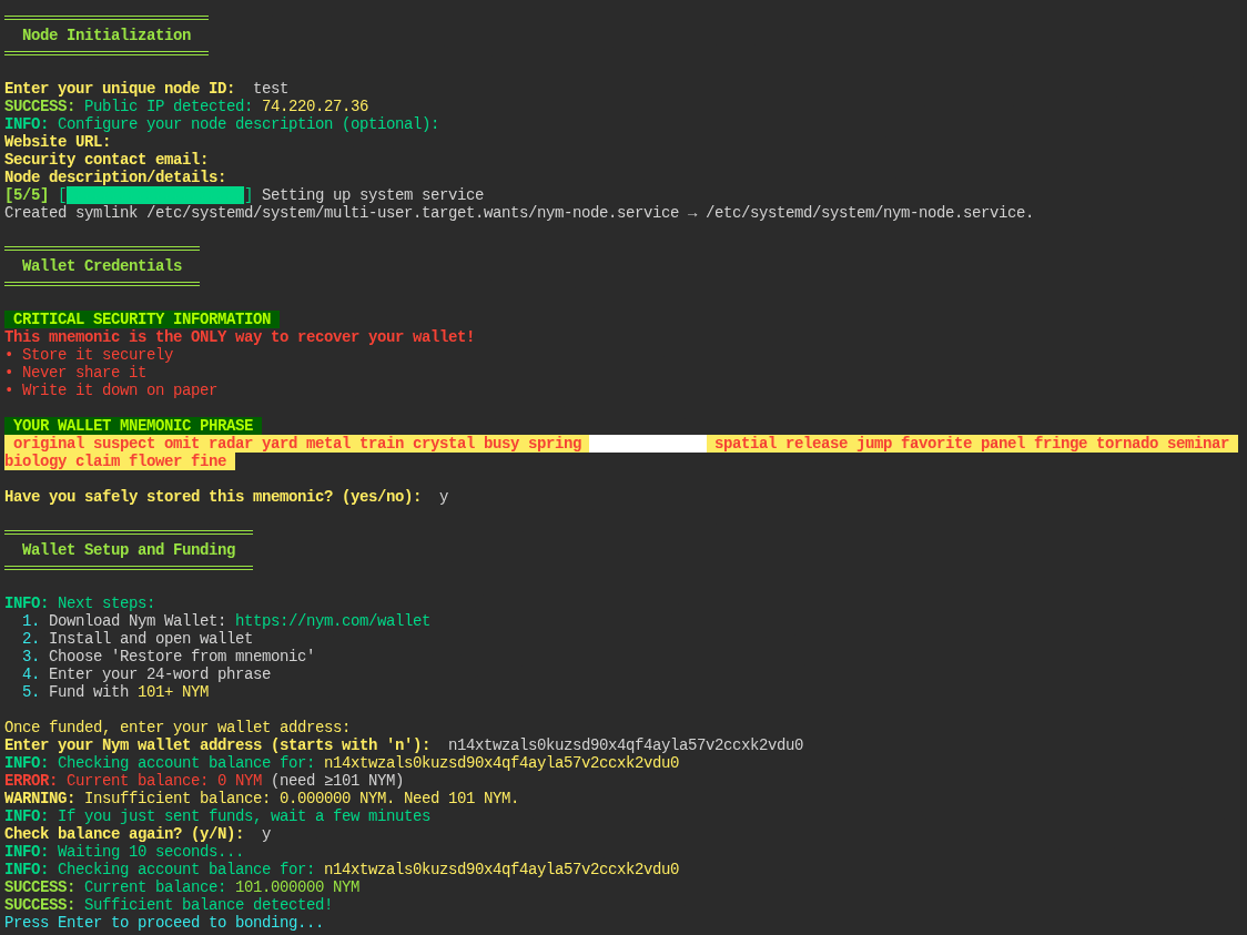 • Node Deployment : It downloads the Nym binary, initializes the node’s configuration, and sets up a systemd service for its continuous operation.