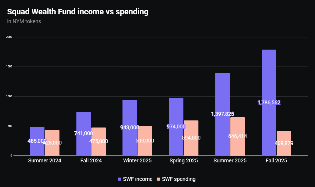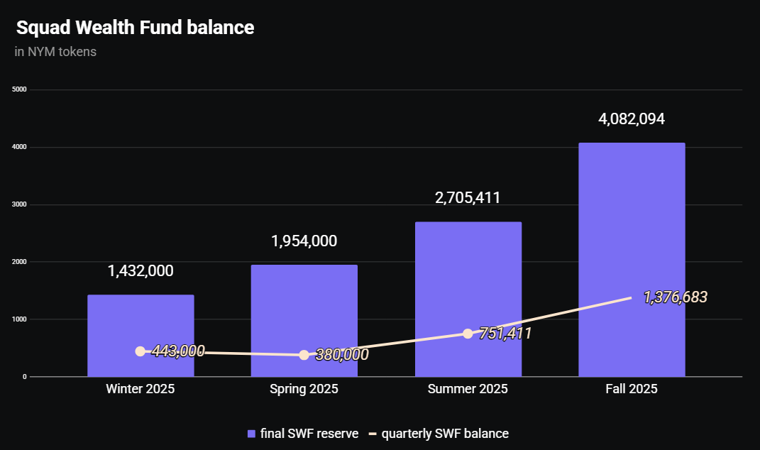 The Squad Wealth Fund (SWF) is the community treasury. Every season, it’s replenished through the Nym Delegations Program and allocated to community missions, development, events, and operations.