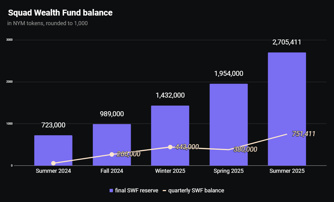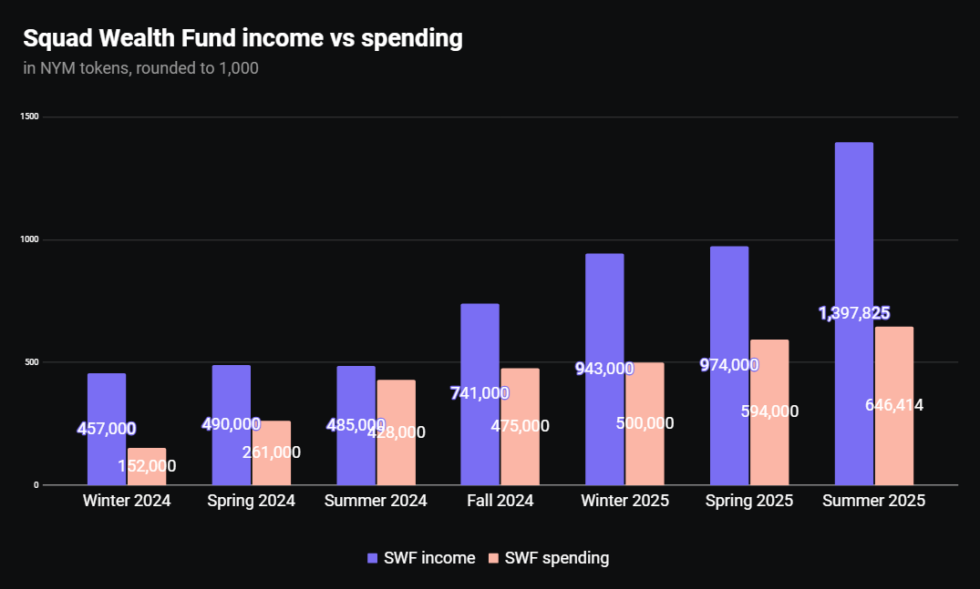 The Squad Wealth Fund (SWF) is the community treasury. Every season, it’s replenished through the Nym Delegations Program and allocated to community missions, development, events, and operations.
