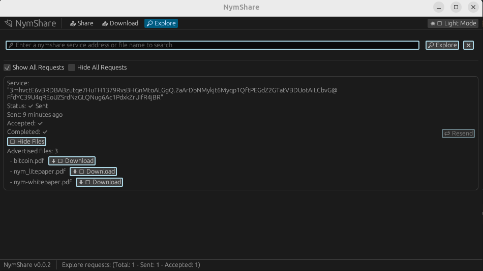 Hi, Could you please add some files and send me the address? Here’s mine 3mhvctE6vBRDBABzutqe7HuTH1379RvsBHGnMtoALGgQ.2aArDbNMykjt6Myqp1QftPEGdZ2GTatVBDUotAiLCbvG@FfdYC39U4qREoUZSrdNzGLQNug6Ac1PdxkZrUifR4jBR you should be able to Advertised Files: 3 as I’m offering bitcoin.pdf, nym_litepaper.pdf, and nym-whitepaper.pdf.” Then search for one of them in search bar.. I’m working to add show/hide files for each request