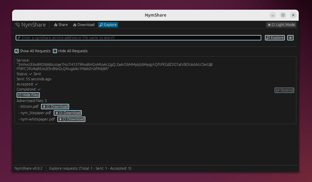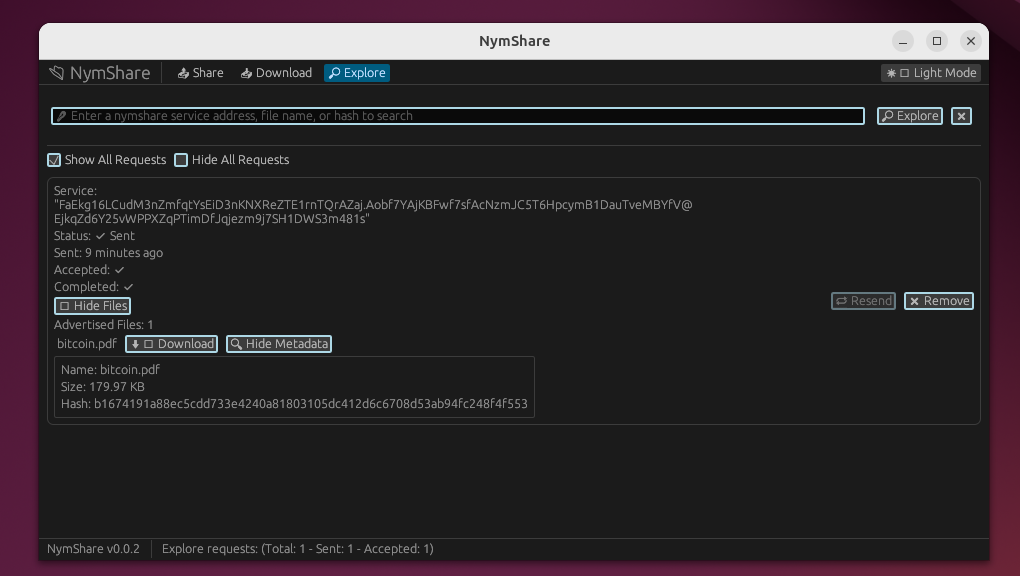 Now, when exploring advertised files, users can view each file’s size and SHA-256 hash prior to downloading. All downloads from advertised files are verified against the advertised file size and SHA-256 hash, ensuring the received file matches the claimed metadata of the file that users asked for, preventing delivery of incorrect or tampered data. Additionally, users can now search for files by their SHA-256 hash in the explore tab’s search bar, with matching files prominently displayed assume they can be found on any explore request..