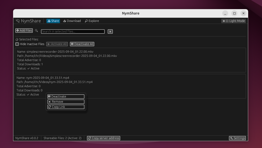 I made some improvements to the backend. Before pushing the changes, I was experimenting with the UI design. Currently, the buttons are visible next to each shareable file, but I’m thinking of removing them and instead adding a context menu for each file.