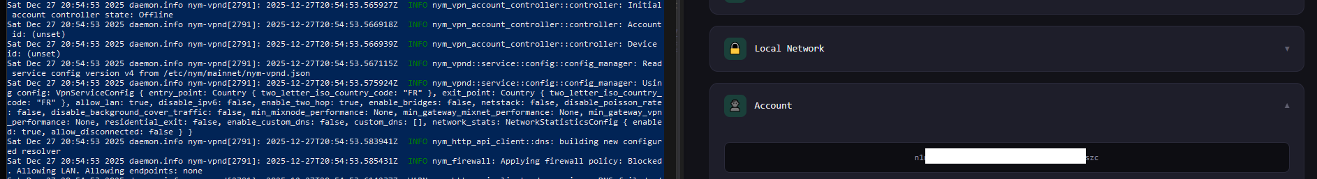 INFO nym_vpn_account_controller::controller: Account id: n1rdwm5mygue87x2pnja60t4fh3g340pse3u2szc