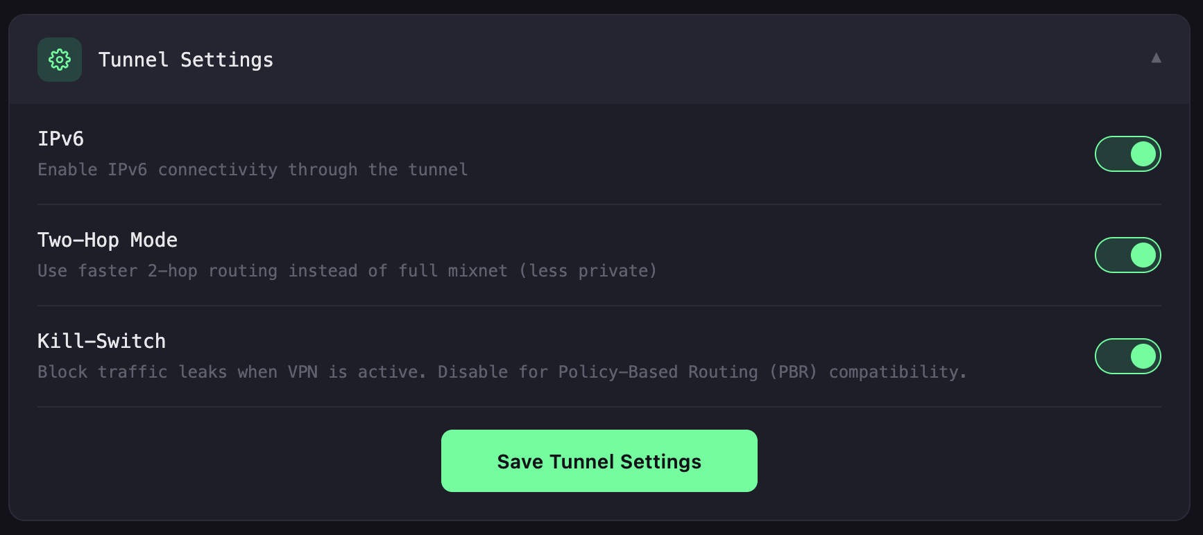 Please add an option to disable routing on the vpn interface so that I could use pbr to route certain domains to the nymvpn mixnet
