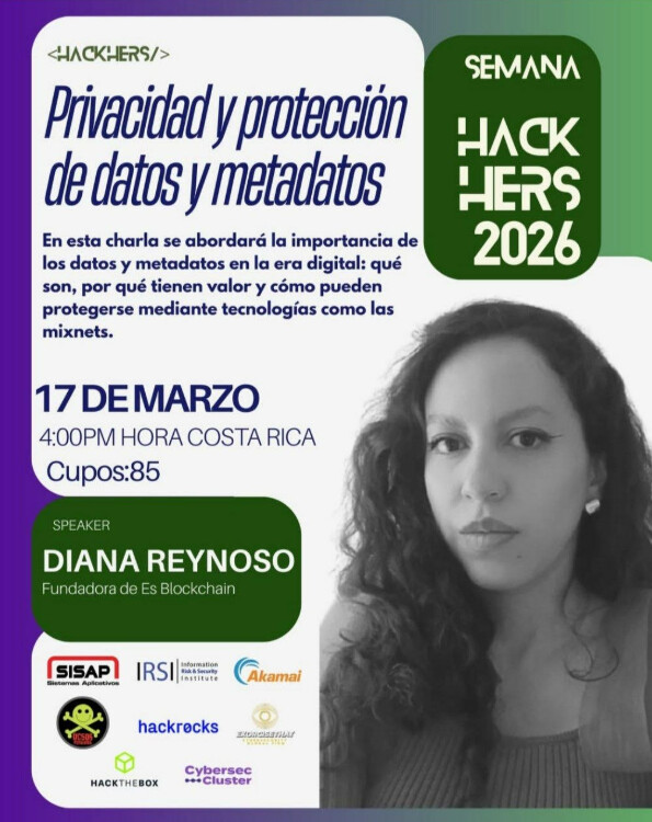 On march 17th I gave an online talk titled Privacy and data and metadata protection, for HackHers community, which is an international community, based in Costa Rica, that promotes the advancement of women in technology and cybersecurity by connecting talent from different countries through hands-on learning, mentoring, and real-world experiences.