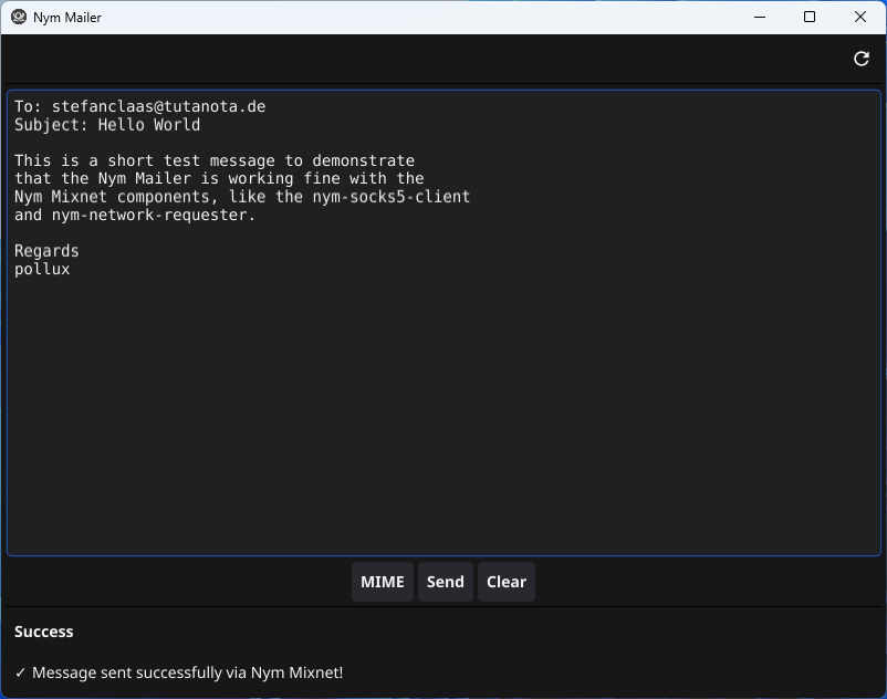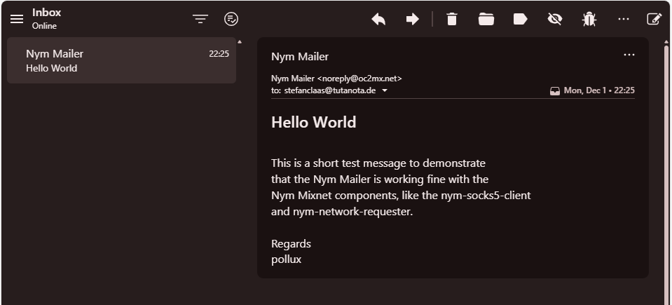 Here you can see the GUI and the anonymous email, send through the Nym Mixnet and it’s headers: