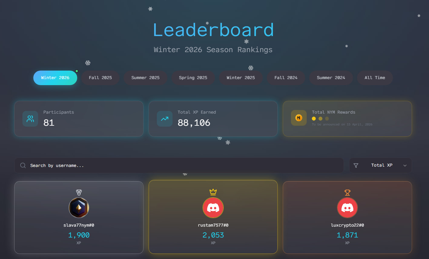 | @unclelem | Community | Translations | Translations of announcements, the Nym blog, and the NymVPN interface and content to Russian - January 2026 | 43,312 NYM |